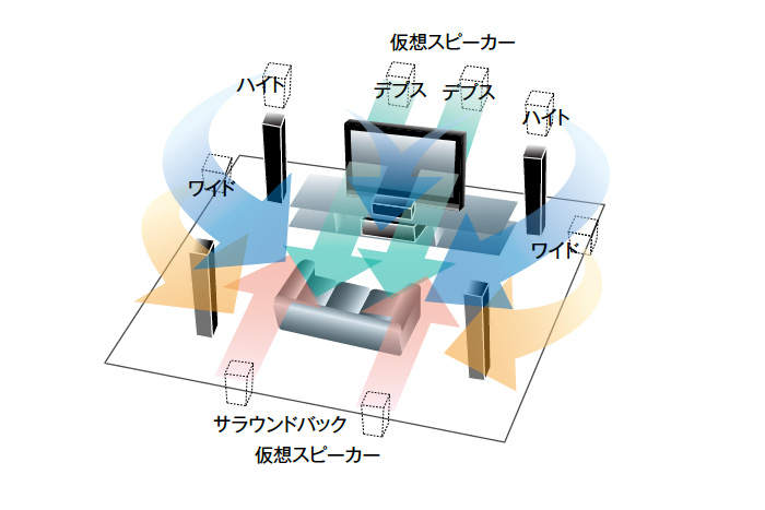 また、仮想11.1ch音場を楽しめるバーチャル3Dサウンドを搭載。高さ方向、横方向、後方向、画面奥行き方向にもスピーカーがあるような立体的な音場空間を5.1chのままで再現します。このバーチャル3Dサウンドはパイオニアの独自技術です。