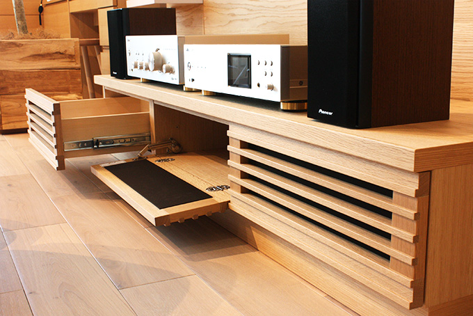 テレビやオーディオを置くのに最適なリビングボード。引き出しや扉を自由にセレクトできます。ルーバー扉の内部には黒いサランネットが張られているので、ボード内に設置したAV機器を見せることなく、リモコンでの操作も可能です。オーディオの配線を通すための通線孔を天板や棚板に追加したり、AV機器の数に合わせてコンセントを取り付けるなどのカスタマイズも思いのまま。最近ではリビングボードにテレビを置かず、オーディオを置いたり趣味のアイテムをディスプレイされるお客様も増えているのだそう。豊富なパーツを持つ、システムファニチャー amはフレキシブルな対応ができます。