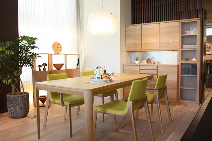130坪の広々としたカンディハウス横浜は、「もっと家時間を愉しもう」をテーマに提案する6つのシーンとおすすめの製品が並ぶゾーンで構成されています。こちらは、2015年4月にリニューアルされたばかりのメインシーン「Happy-楽-」。新居を建てる際に、明るいリビングを一番に希望された30代ご夫婦とお子様2人の4人家族を想定したコーディネート。自然光が降り注ぐ中に、ナラ材や軽やかなファブリックの家具が心地よく調和しています。こちらのコーディネートから、こだわりの家具をピックアップしてご紹介します。