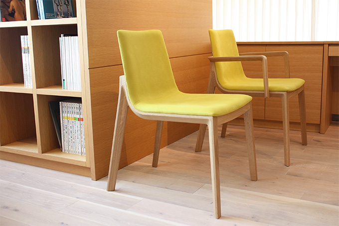 "アンバランスの存在感"をキャッチフレーズに持つ、チャレンジ ダイニングのサイドチェアー、アームチェアー。強度を保ちながらぎりぎりまで削り込んだフレームのデザインが、空間を個性的に演出します。「Happy-楽-」シーンのコンセプトに合わせ、ナラ材のフレームにイエローの張り地をセレクト。取材時の初夏の陽気にもピッタリな、楽しく心地よい組み合わせです。