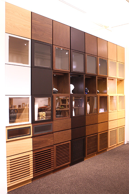 ショップ内に設置された、システムファニチャーam[アム]の樹種・塗装とパーツの見本コーナー。木質感を活かした木目が横方向となったエスポワ(N)タイプと、ナチュラルな木目が縦方向となったエスポワタイプ。ナラ、ウォルナット、ヒッコリーの塗装違い。ガラス扉、ルーバー扉やサランネットなどさまざまなバリエーションが確認できます。