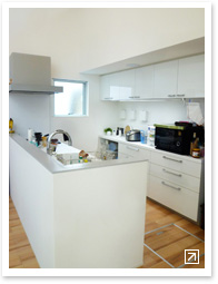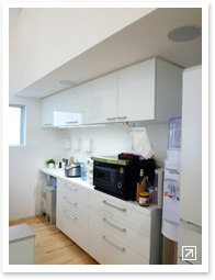 ご夫婦が共働きのため、1日の大半をキッチンやリビングで過ごすのはお母様。 テレビを観るよりも大好きなJ-POP(森山直太朗からEXILEまでご自分でiPodにダウンロード! とっても若々しいお母様です)を聴きながらキッチンに立っているとのこと。お母様が操作しやすいようにと設計士さんの提案でインウォールアンプは箱に設置され置き型になりました。これは新しい試みですね。