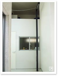 建築する際に希望をだした"それぞれの世帯のプライベートスペースの確保"を実現するために設計士さんが考えたのは家の中の街角。玄関を入るとシンプルなドアと窓を持つ箱が並んだちょっとした路地裏のようになっており、それぞれの世帯のお部屋へと繋がっています。実際に街灯に使われる照明も設置されて本格的。