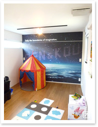 また、子ども部屋には宇宙をモチーフにした子どもたちの名前が入った特注の壁紙、中庭に面した廊下にはホワイトボードになるペンキを塗った大きな伝言板、とこだわったコーナーがたくさん。ペンキを塗る作業は御家族で担当し、子どもたちにも印象深い家づくりとなったようです。