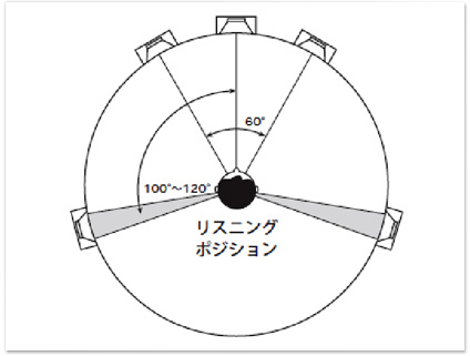 5.1chの設置場所は国際電気通信(ITU-R)の勧告で下記のルールに従って制作されており、このルールでスピーカーを配置すれば制作スタジオと同じ高品位な音場を味わうことが出来ます。