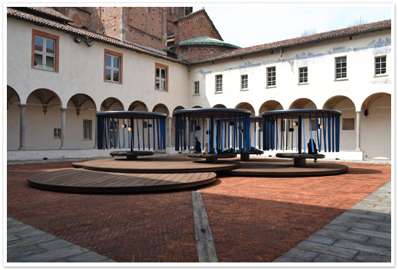 個人的に最も長い時間滞在してしまった展示会場がココ! 中庭に設置された大きな回転ソファですが、いったい何を表現しているのでしょうか。 答えは後日、レポートの中でお伝えしますのでどうぞお楽しみに!