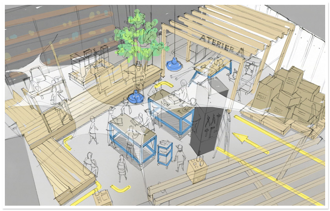 (左)手前は、かつて建材として利用されていたオールドチークを天板にしたローテーブル。豊かな素材感が魅力です。FRAME TABLE 105,000円。奥は、イデーで大人気のソファに、デッドストックの生地を貼りこんだ限定品。通常よりお求めやすい価格で、イデー・ガレージで限定販売されます。AO SOFA (2) デッドストック張り地 123,900円〜(通常の「オーダー張り地」価格 155,400円〜)。