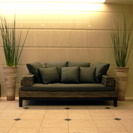 ソファのフレームはウォーターヒヤシンス(ホテイアオイ)を編んだもの。両サイドに、同じ種類の植物(ストレリチア・ジャンセア)を配置して。