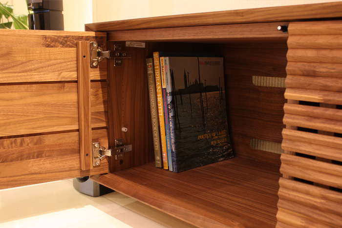 左側の扉内のスペースは棚板を外せばA4サイズの本を立てて収納出来る設計になっています。ロータイプのテレビボードでA4サイズが縦に入るものは意外と少ないそう。