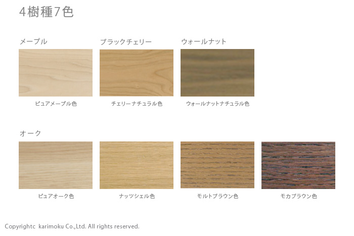 テレビボードの色はカラーコーディネートしやすい4樹種、7色から選ぶことができます。無垢材はメープル、ブラックチェリー、ウォールナット、オークの4樹種。オーク材を塗装したナッツシェル色、モルトブラウン色、モカブラウン色の3色の合計7色です。木材と塗装色によって印象が違ってきますね。最近の人気はダントツでウォールナットだそうです。