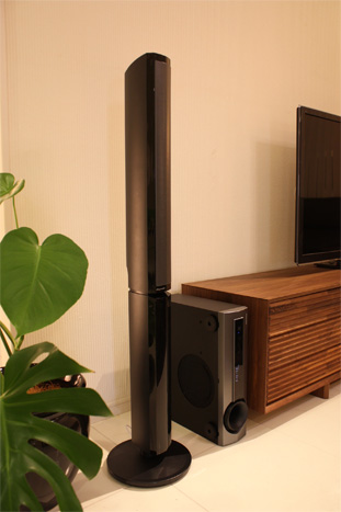 6.6cmコーン型ウーファーと2.6cmセミドームトゥイーターを組み合わせた、2Wayワイドレンジスピーカーシステムのトールボーイスピーカー4本に加え、センタースピーカー、アンプサブウーファーで構成されたホームシアターシステムです。本格的な5.1chサラウンドが楽しめます。
