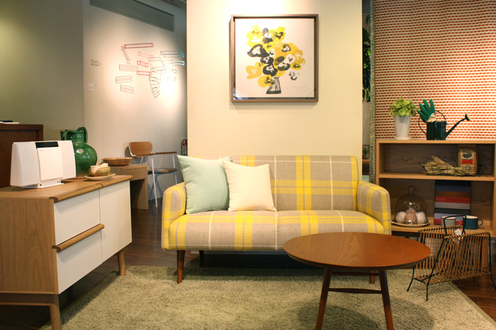 2人掛けソファ「シエラ ソファ」、ミニコンポが載ったサイドテーブル「モノ テーブル」、1人掛けソファ「ダヴ ラウンジ」、ハンガースタンド「ポール ハンガー スタンド」、中央のローテーブル「リル ローテーブル」、手前の「スイス アーミー スツール」(ヴィンテージ)15,750円