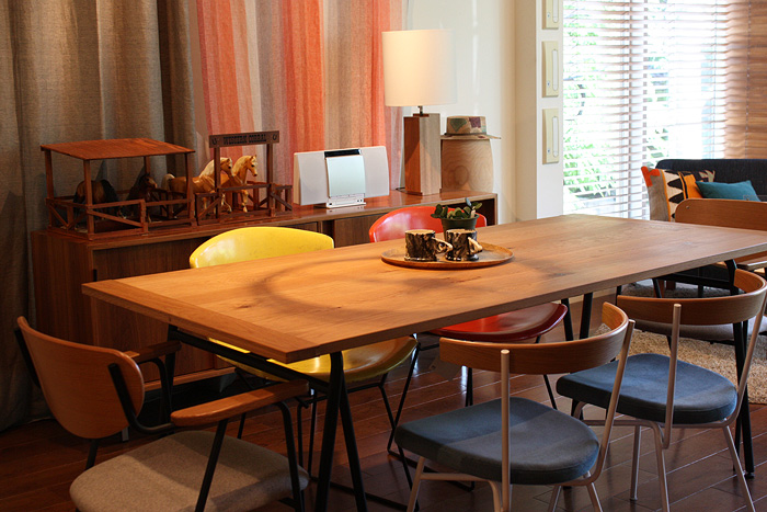 木の素材感を大切にした無垢の天板に、すっきりとしたブラックスチールを組み合わせたダイニングテーブル「スデュー テーブル」。体に沿うように湾曲した成型合板の背とアームレストがついたチェア(左)「ジャンゴ アームチェア」と、スチール脚と成型合板の背、ファブリック張りの座面の組み合わせがカジュアルなチェア(右)「フェレ チェア」。アメリカ西海岸から輸入されたビンテージのチェア(奥)をコーディネートした温かみのあるダイニングシーンです。