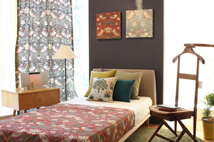 右手のハンガースタンド&チェアと、左手のサイドテーブルはヴィンテージ。ウィリアム・モリスのファブリックと良く合います。