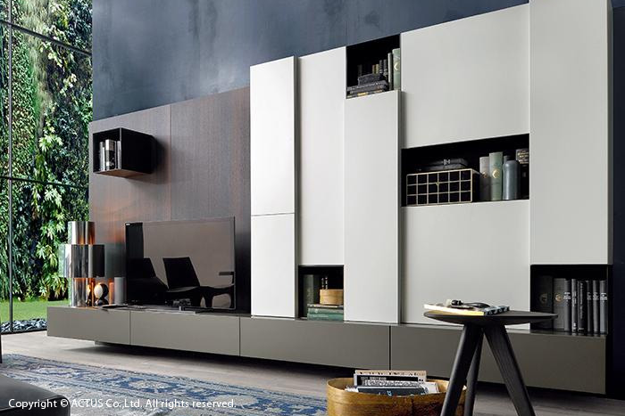 こちらは、メインカットと同様のシステムユニット「SINTESI」。ハンギングキャビネットは、大きなサイズへ。床置きだったAVキャビネットもこちらでは壁かけに。カラーや素材、組み合わせるモジュールによって、ガラッと印象が変わる「SINTESI」。自分だけの空間作りのお手伝いをしてくれます。