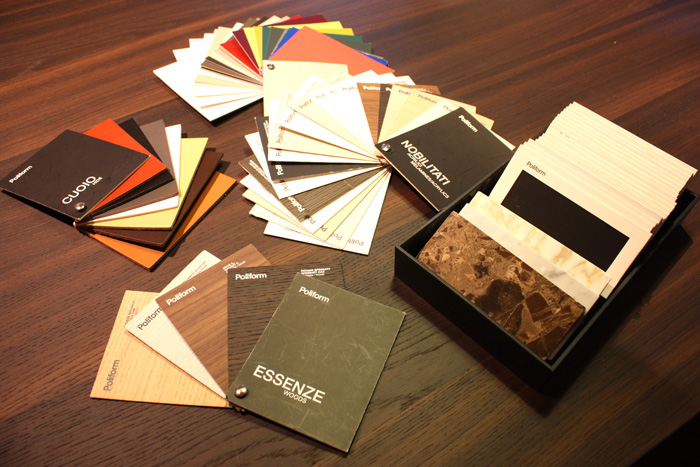 家具によってセレクトできるカラーや素材は変わりますが、例えば、システムユニット「SINTESI」では、ナチュラルオークとスぺッサートオークの2色のウッド、32色のマットカラー、16色のグロッシーカラーから組み合わせることができます。