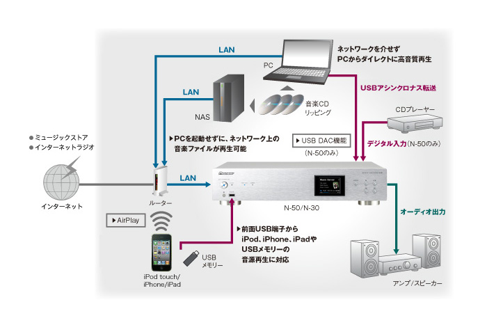 「ネットワークオーディオプレーヤー N-50」は、音楽をもっと自由に楽しむことができる次世代オーディオ。ネットワークをを介したり、パソコンからダイレクトに繋いだり、USBメモリーを差したり、スマートフォンからBluetoothで繋いだりして音源を再生します(左図参照)。