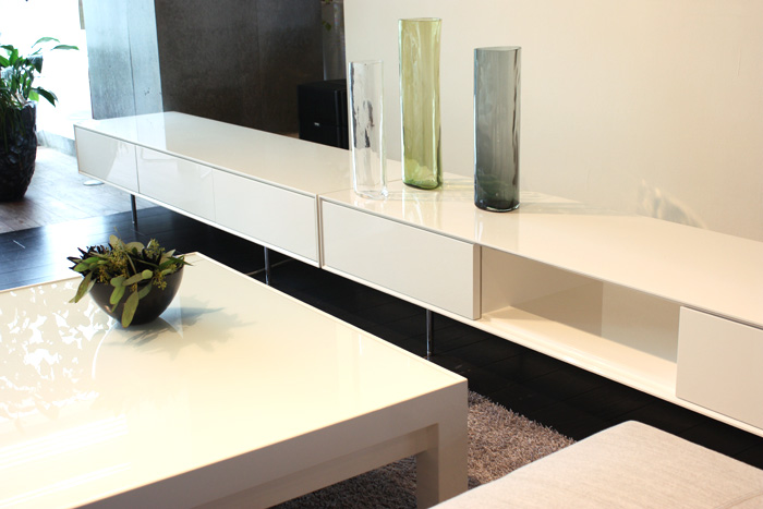 ガラっと印象が変わって、ミニマルなモノトーンの空間も素敵ですね。こちらは、「COMPOSITION LOW(コンポジション ロー)」。低めのキャビネットなので、ますますお部屋が広く見える効果も。仕上げは、MDF鏡面ホワイトとなっています。