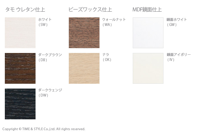 仕様は、引き出し、扉、AVラックの組み合わせから。素材と塗装は、タモ材のウレタン仕上げが、ホワイト(SW)、ダークブラウン(DB)、ダークウェンジ(DW)の3色。ウォールナット(WA)、ナラ(OK)材はビーズワックス仕上げ。MDF鏡面仕上げは、鏡面ホワイト(GW)、鏡面アイボリー(IV)から選ぶことができます。また、タモ材、ウォールナット、ナラ材の前板は、凹凸が美しいWAVEに加工されたもの、フラットな表面のものから選ぶことができます。