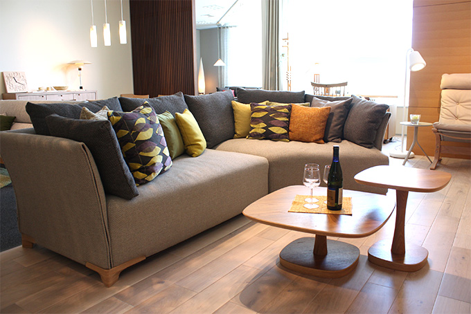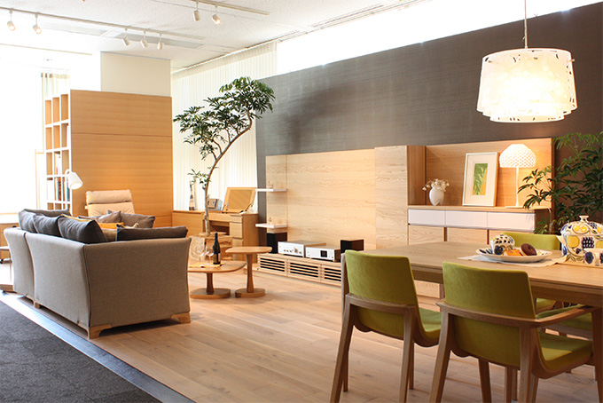 130坪の広々としたカンディハウス横浜は、「もっと家時間を愉しもう」をテーマに提案する6つのシーンとおすすめの製品が並ぶゾーンで構成されています。こちらは、2015年4月にリニューアルされたばかりのメインシーン「Happy-楽-」。新居を建てる際に、明るいリビングを一番に希望された30代ご夫婦とお子様2人の4人家族を想定したコーディネート。自然光が降り注ぐ中に、ナラ材や軽やかなファブリックの家具が心地よく調和しています。こちらのコーディネートから、こだわりの家具をピックアップしてご紹介します。