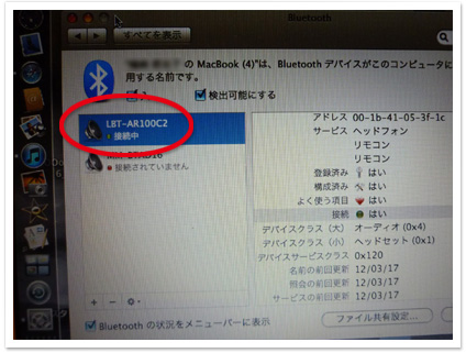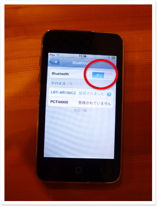 次にペアリングしたい機器のBluetooth機能をオンにすると相手を検索して自動登録されます。複数検出した場合は、ペアリングしたい機器の登録リストの中からレシーバー名を選べば接続完了!(通信を開始すると青く点滅します。)