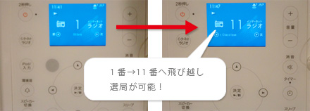 1番→2番→3番と順送りでその都度放送局を読み込み11番を選局するには、この動作を10回繰り返しとなります。