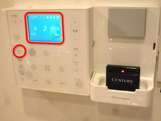 ACCO インウォールアンプのドックコネクタにBluetoothオーディオレシーバーを差し、「iPod/入力」ボタンでiPodを選びます。