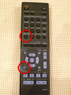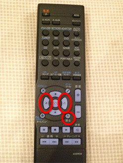 いつものリスニングポジションに座り、リモコンのAVアンプボタンを押してから、ホームメニューボタンを押してホームメニュー画面を表示します。